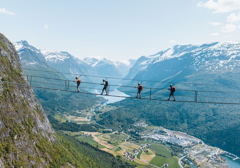 We highly recommend using a guide. Guided tours and gear rental via Loen Active. Return to fjord level by Loen Skylift, or by foot on the mountain road (7+5 km). You can book via Ferrata tour with an instructor at 9, 10, and 11 am, with a maximum of 40 guests per departure. Rental of via Ferrata equipment to experienced climbers. On Saturdays, and every day from 1 July to 15 August, the equipment can only be rented from 2 pm. Otherwise, in the season it may be possible to start before 2 pm (contact Loen Active).