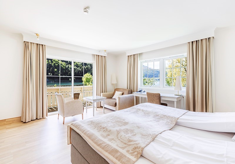 Store dobbeltrom med balkong og utsikt mot elva. Alle romma har parkett.
